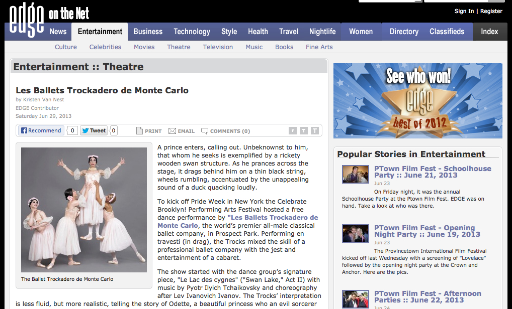 To kick off Pride Week in New York the Celebrate Brooklyn! Performing Arts Festival hosted a free dance performance by “Les Ballets Trockadero de Monte Carlo,” the world’s premier all-male classical ballet company, in Prospect Park. Performing en travesti (in drag), the Trocks mixed the skill of a professional ballet company with the jest and entertainment of a cabaret.