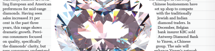 Today, China is the world’s second largest diamond market, tripling in size in the past five years to US$22.8 billion. Sotheby’s in Hong Kong was also recently host to the record-breaking purchase of a US$30.8 million white diamond. As with many luxury trends in China, at first the con- sumer base wants nothing less than what they perceive as ‘best in class’ items, but as the market matures, tastes become more sophisticated. Currently, Chinese are rivalling European and American preferences for mid-range diamonds. Having seen sales increased 31 per cent in the past three years, this range shows dramatic growth. Previous consumers focused on quality, specifically the diamonds’ clarity, but new consumers understand that high and low quality diamonds may not differ greatly in appearance. Last year, SI dia- monds (the rating Slightly Included, meaning with minor internal defects), which have the same level of clarity American consumers favour, accounted for 30 per cent of sales in China.