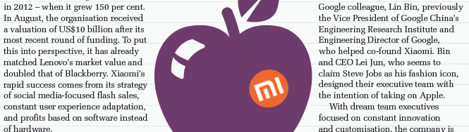 Xiaomi was founded in October 2011 and has been growing rapidly since. In the first half of 2013, the company’s revenue reached RMB 13.27 billion, totalling all of its sales in 2012 – when it grew 150 per cent. In August, the organisation received a valuation of US $10 billion after its most recent round of funding. To put this into perspective, it has already matched Lenovo’s market value and doubled that of Blackberry. Xiaomi’s rapid success comes from its strategy of social media-focused flash sales, constant user experience adaptation, and profits based on software instead of hardware. Using flash sales rather than relying on traditional new product rollout methods, Xiaomi increases hype and demand for its products.